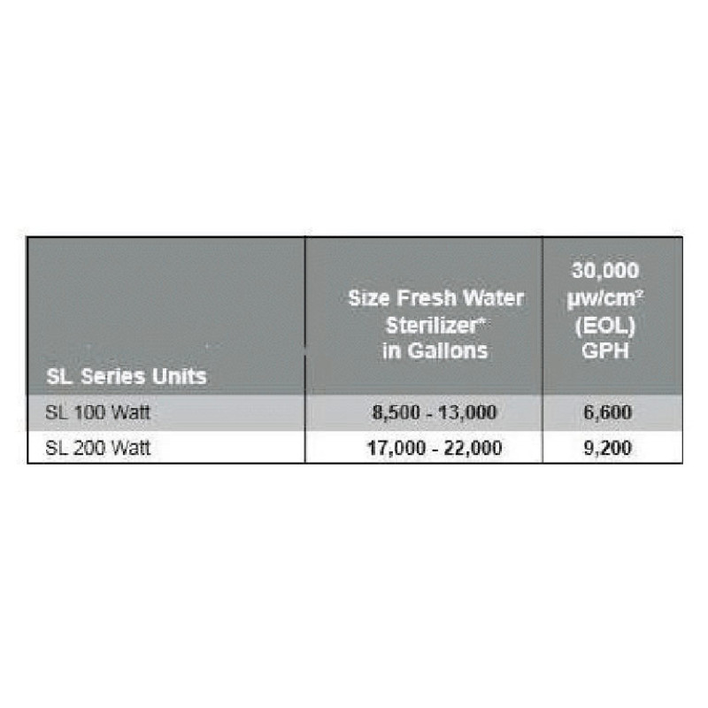 • Salt Water Sterilizer to 1800 gals / Flowrate – 3066 gph for 90,000 µw/cm2
